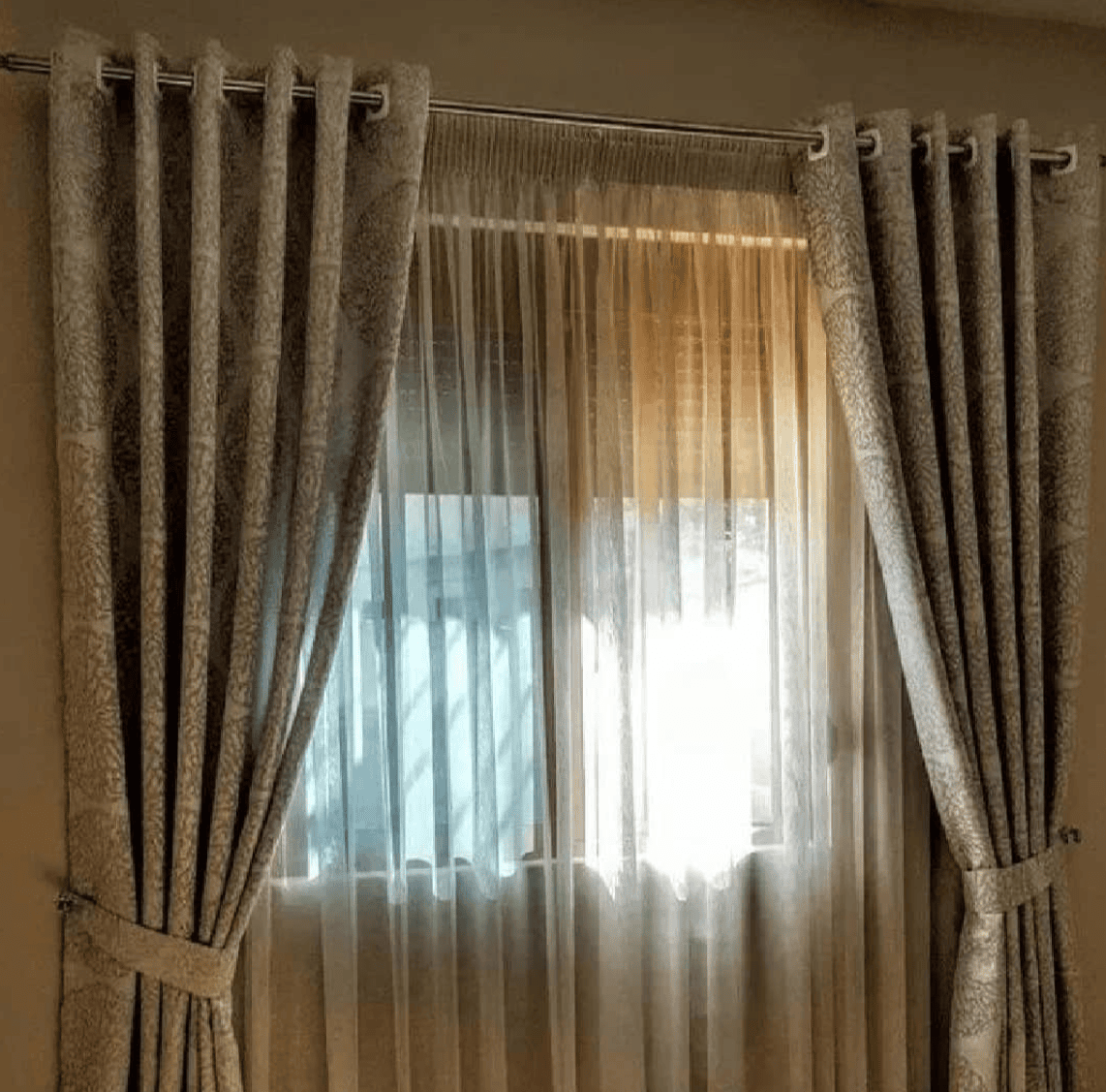 - Draperies: Custom-made with various pleat styles
